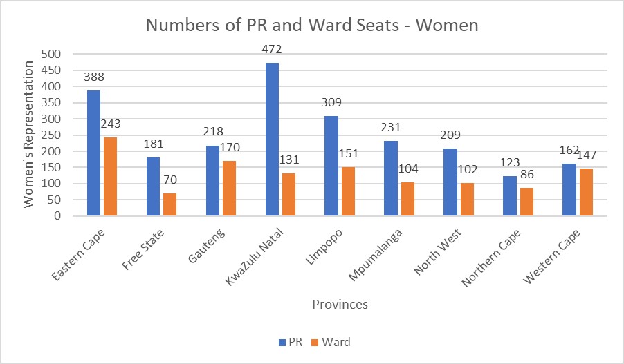 Disaggregated by province, the statistics with regard to women’s representation in local government show that once again, PR seats have resulted in a higher number of women being elected into council through PR seats, in contrast to ward seats.