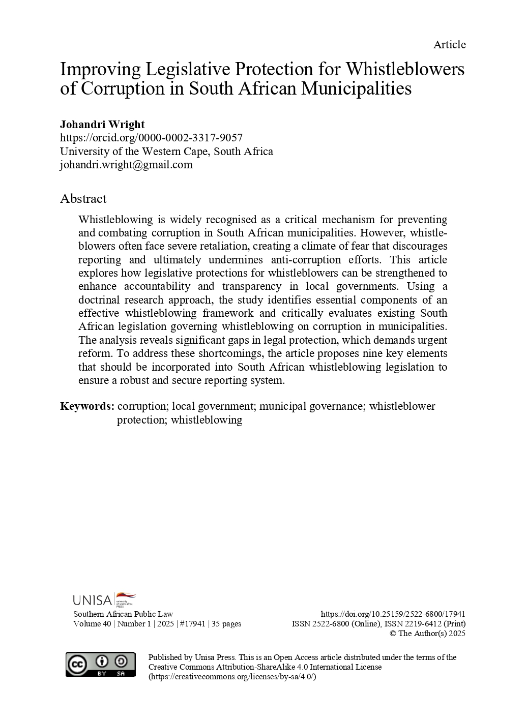 This article explores how legislative protections for whistleblowers can be strengthened to enhance accountability and transparency in local governments. Using a doctrinal research approach, the study identifies essential components of an effective whistleblowing framework and critically evaluates existing South African legislation governing whistleblowing on corruption in municipalities. The analysis reveals significant gaps in legal protection, which demands urgent reform. To address these shortcomings, the article proposes nine key elements that should be incorporated into South African whistleblowing legislation to ensure a robust and secure reporting system.