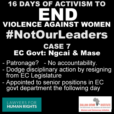 The #NotOurLeaders campaign is calling on the Eastern Cape Department of COGTA to immediately engage in an internal investigation and due diligence exercise with regards to the appointment of Malibongwe Ngcai and Basil Mase. COGTA spokesman Mamnkeli Ngam said in July 2017 that the department “was not aware” of any judgment against the two and thus could not comment on the matter. This is unacceptable.
