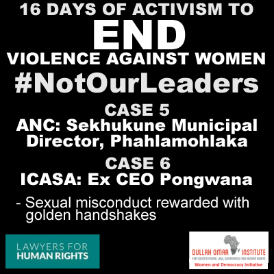 About the #NotOurLeaders campaign During this year’s 16 Days of Activism, the Women and Democracy Initiative (WDI) of the Dullah Omar Institute at the University of the Western Cape, Lawyers for Human Rights (LHR), and gender violence specialist, Lisa Vetten, turn the spotlight on political representatives accused of sexual violence and the practices that protect and enable their sexual misconduct and abuse. By contrasting the range of incidents reported with parties’ inconsistent – even non-existent – responses, the campaign aims to demonstrate the chasm between political-speak and political actions on sexual violence. The campaign emphasises the need for strong political leadership by all political parties and representatives in tackling the pervasive problem of sexual violence in South Africa. |